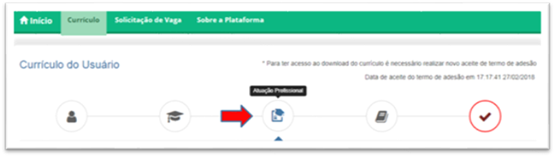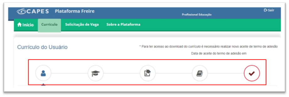 Feito o login, você notará que o currículo está dividido em cinco abas para navegação e preenchimento pelo usuário: