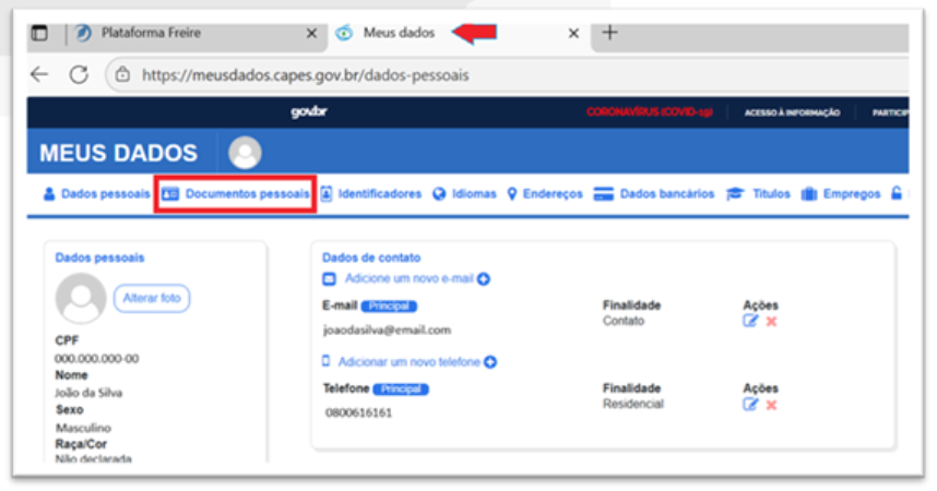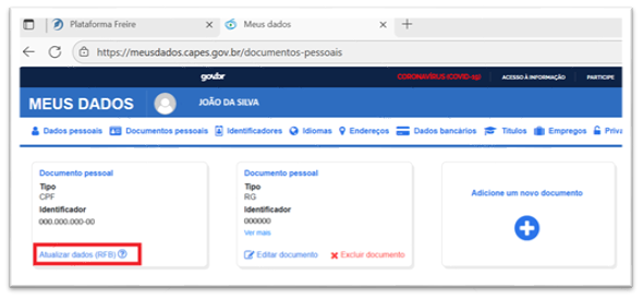 Após clicar em “Atualizar meus dados” na Plataforma Freire, uma nova guia se abrirá em seu navegador com o sistema Meus Dados. Confira suas informações e, caso seja necessário, clique em “Documentos pessoais” e, depois, “Atualizar dados (RFB)”. Assim, o sistema irá atualizar com dados já cadastrados na Receita Federal. Se precisar realizar outras alterações, clique em “Dados Pessoais”, “Editar dados pessoais” e faça as alterações.