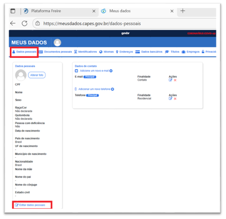 A tela inicial da Plataforma Freire será na guia referente aos Dados Pessoais e apresentará suas informações de identificação e de contato. Ao acessar com sua conta gov.br, alguns dados já podem estar preenchidos. Confira se estão corretos.
