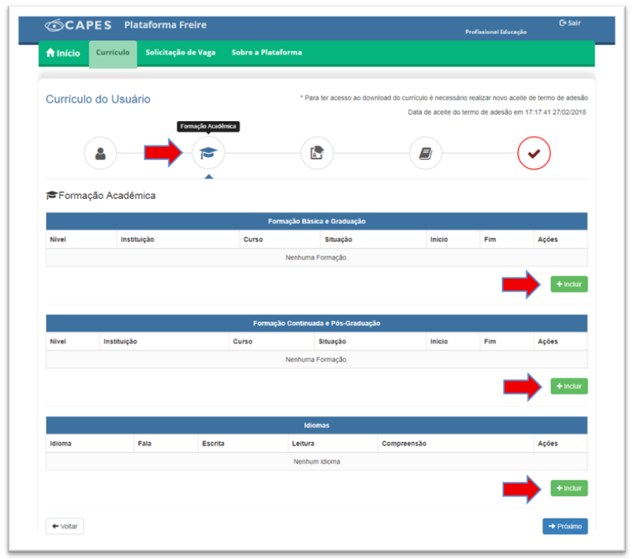 A aba seguinte trata de Formação Acadêmica. Nessa etapa, você irá informar seus dados de Formação Básica e Graduação; Formação Continuada e Pós-Graduação; e Idiomas. Clique em “Incluir”, para iniciar o preenchimento das informações.