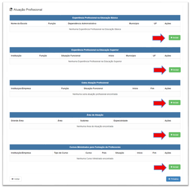 Já a experiência profissional deve ser cadastrada na aba “Atuação Profissional”. Clique em “Incluir” em cada campo para inserir sua experiência em sala de aula ou em outras funções.