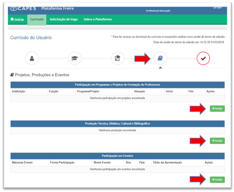 Agora, para cadastrar a participação em programas, projetos e eventos, clique na aba “Projetos, Produções e Eventos”. Ao clicar em “Incluir” em cada campo, você pode preencher suas informações.