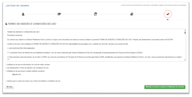 Por fim, ao concluir o preenchimento do currículo, é necessário ler atentamente o Termo de Adesão da Plataforma Freire. Em seguida, se estiver de acordo com as condições, selecione a opção “Declaro que li e estou de acordo com o Termo de Adesão e Condições de Uso”.