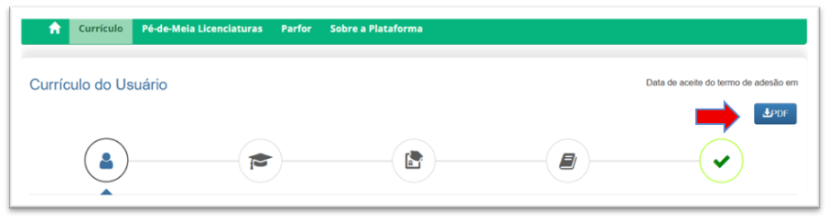 Para realizar o download do currículo, basta clicar no botão “PDF” no canto superior da tela, após o aceite do Termo de Adesão.